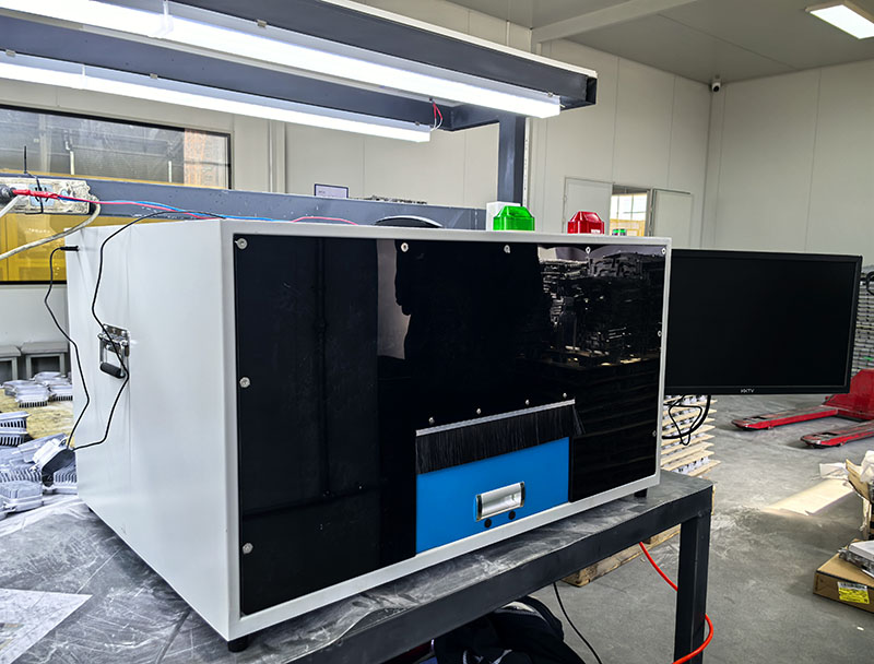 视觉检测工装设备主要由显示器、声光报警器(红)、通过指示灯(绿)、启动按钮(绿)、工件放置抽屉、脚踏开关等组成。